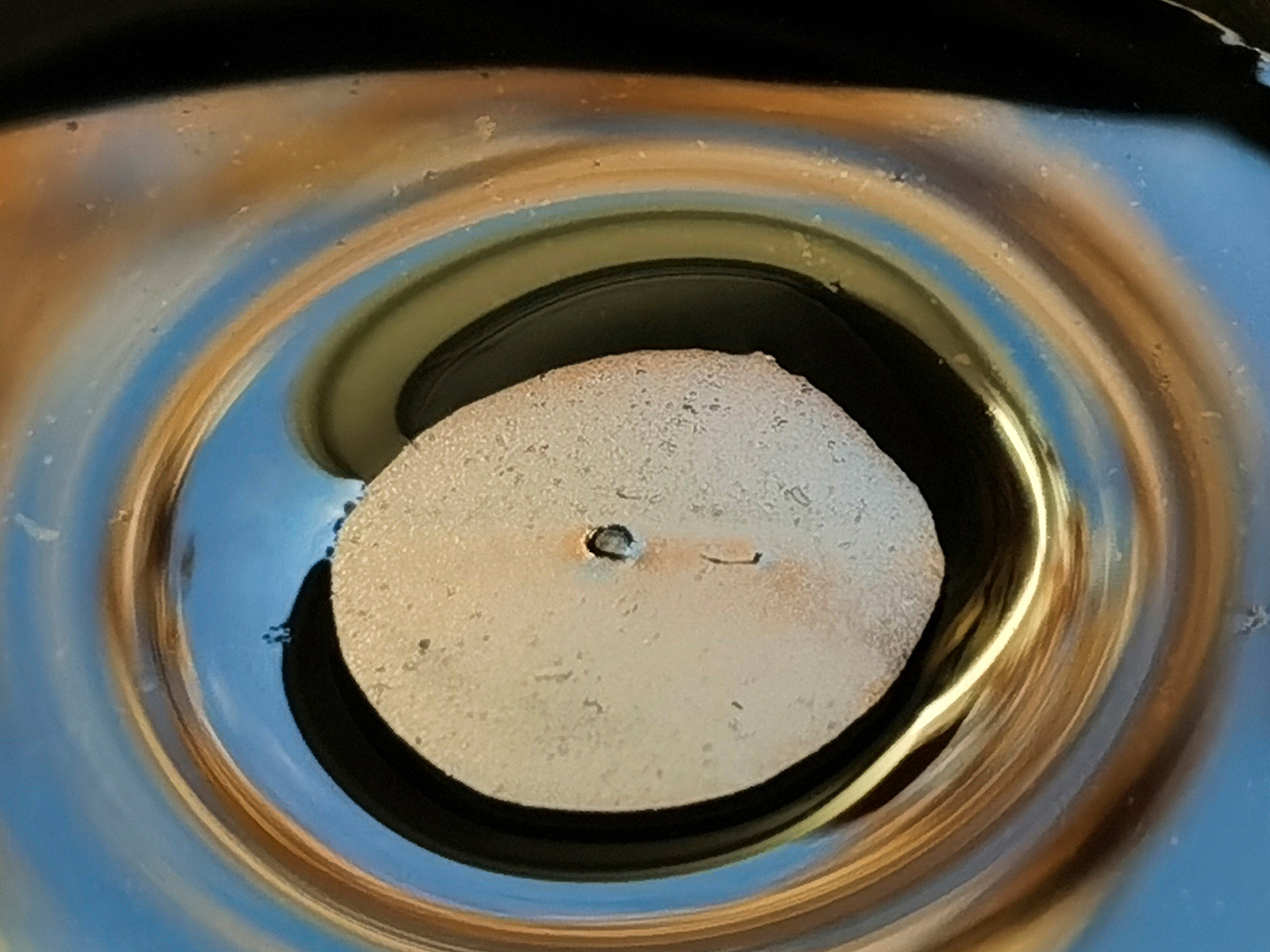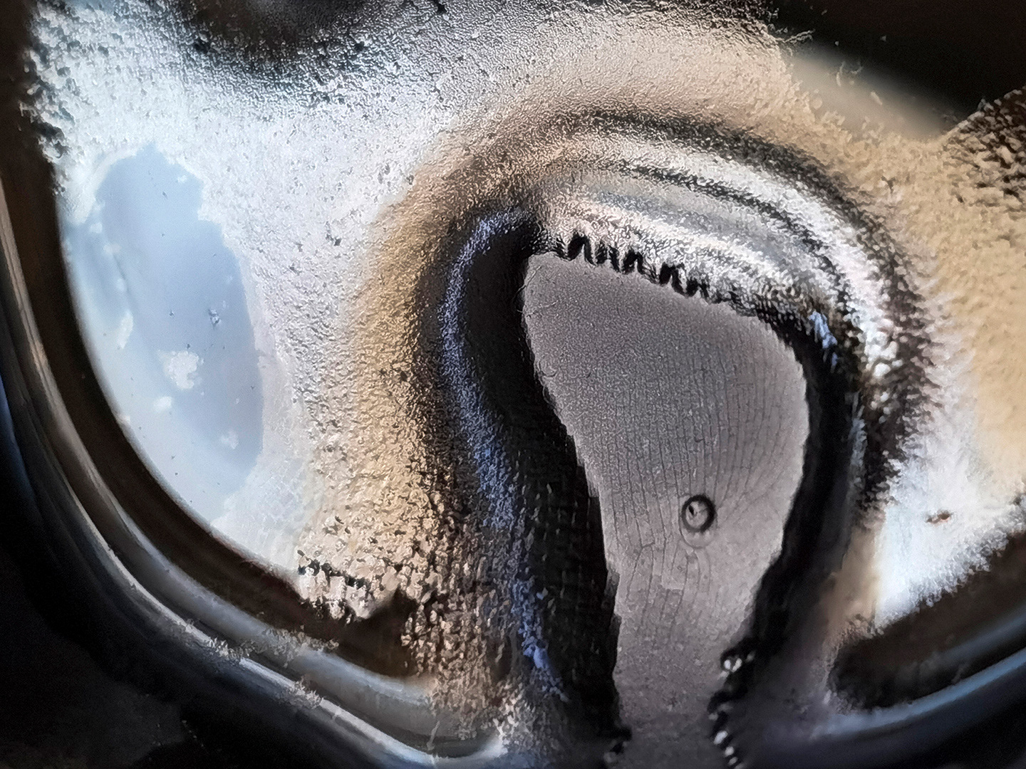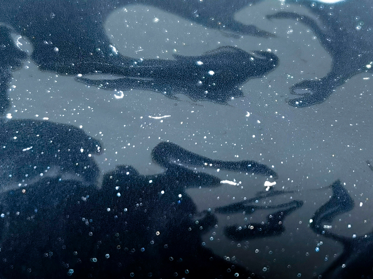 The photographs capture ink in various states of settling and evaporation. Particles suspended in liquid create nebula-like formations; air bubbles trace constellations across dark matter; dried residue forms continents and islands in an ink ocean. The circular geometry of the inkstone creates a natural framing device, echoing both the moon gate of classical Chinese gardens and the porthole through which we observe distant worlds. What appears as vast astronomical phenomena is, in reality, occurring within a hand-sized ceramic vessel.